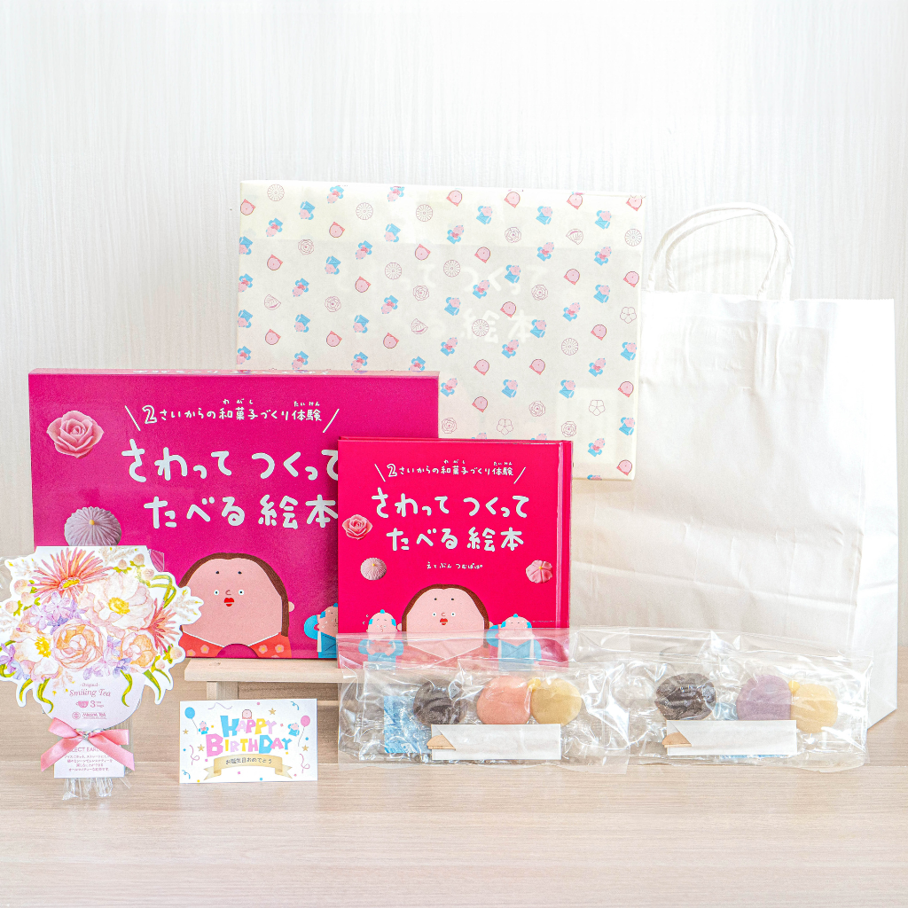練りきりキット2個分と絵本1冊が入った箱をオリジナルラッピングで包んでお届けいたします。